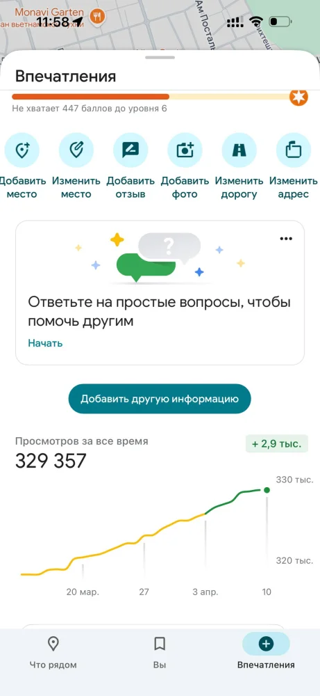 Где найти: Вкладка Contribute («Внести вклад») в нижнем правом углу приложения. Там вы увидите подборку «недавних впечатлений», готовых к публикации.